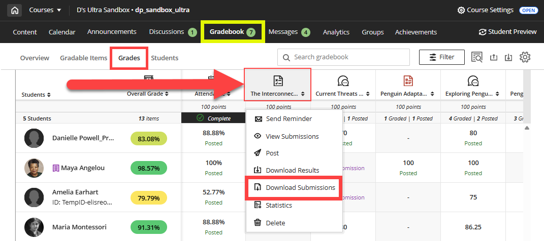 Navigate to your Course Gradebook and select the Grades tab. Next, click on your assignment to open a menu of options. Select Download Submissions.