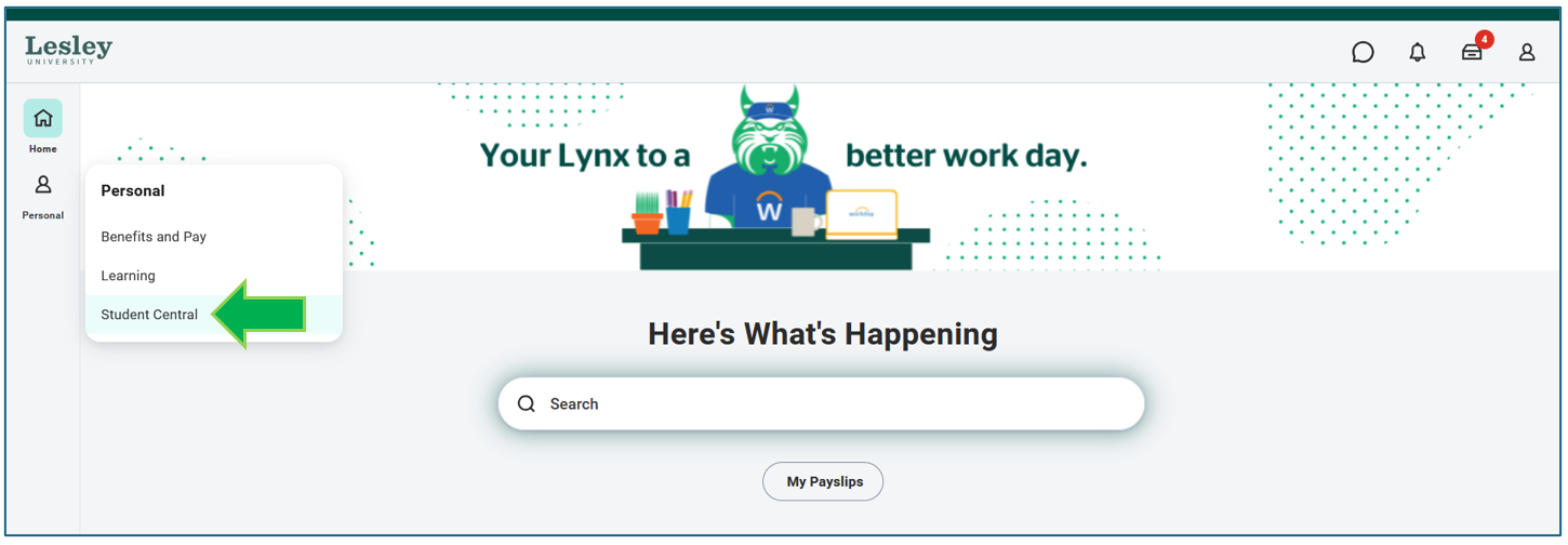 On your Workday homepage, click the Student Central application.