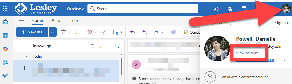 From your Lesley email, click on the Account Manager (your profile picture or initials) button at the top of the page. This will open your account information. Select View Account.