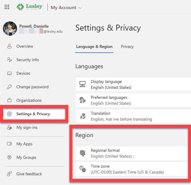 This will bring you to your main Office 365 account. In the My Account menu, click on Settings & Privacy (gear icon). This will open your Languages and Region settings. In the Region area, confirm your Regional format and your Time Zone.