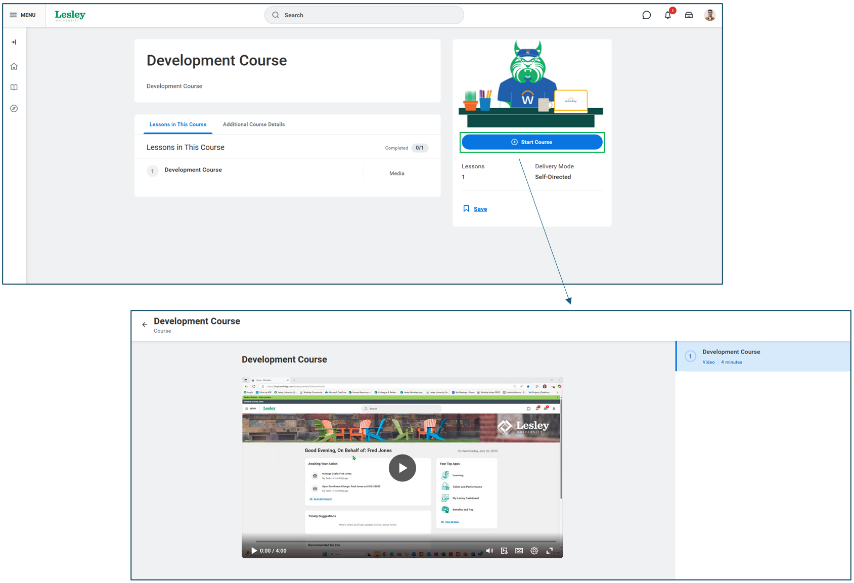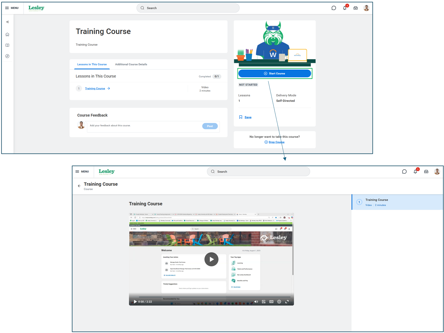 Workday will refresh the page and the Enroll action will now show to Start Course. Allowing you to begin the training immediately.