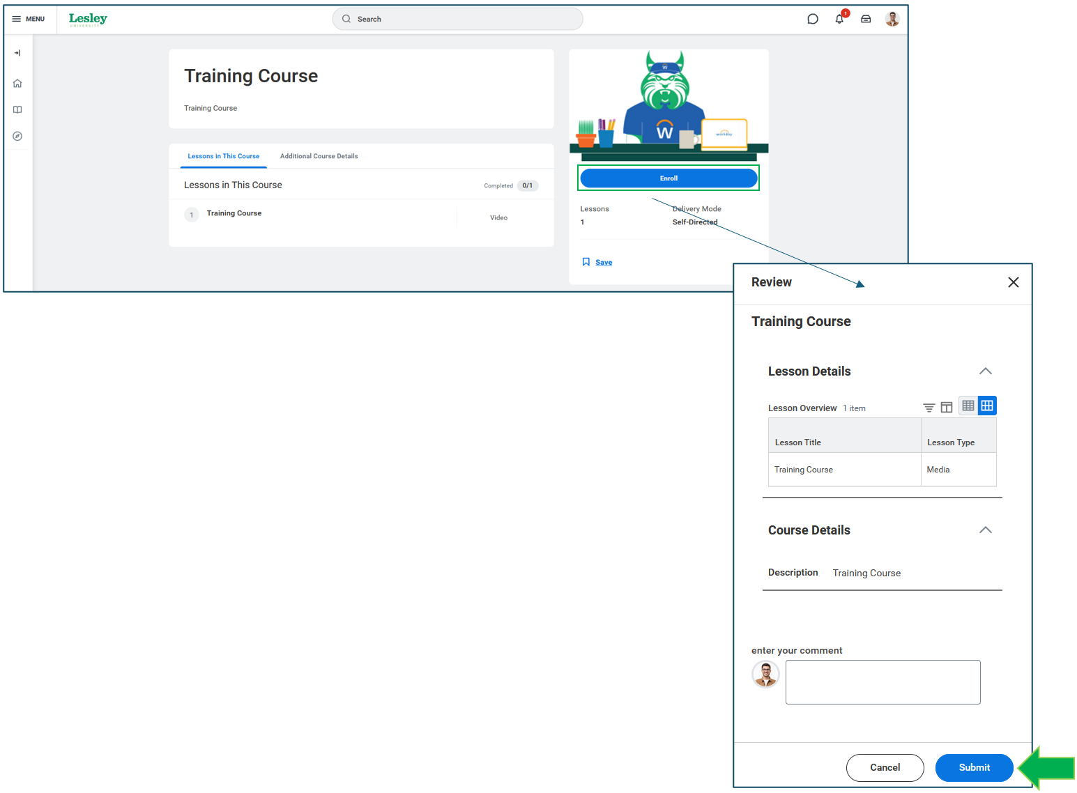 When training material does follow the enrollment process, you will see the action Enroll. When you click it, a pop up will be displayed to providing further details and to confirm. If you want to enroll, click Submit.
