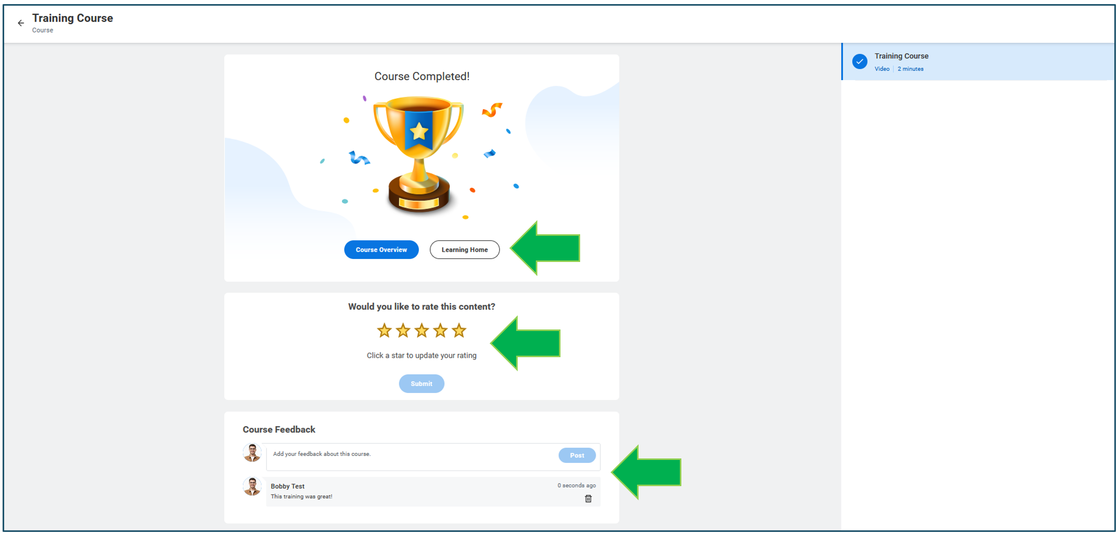 Once you have completed the course, you will receive a confirmation that the course is completed. You can review the Course Overview again or go back to the Learning Home page. You can also rate the content from one to five stars and comment your feedback on the material.