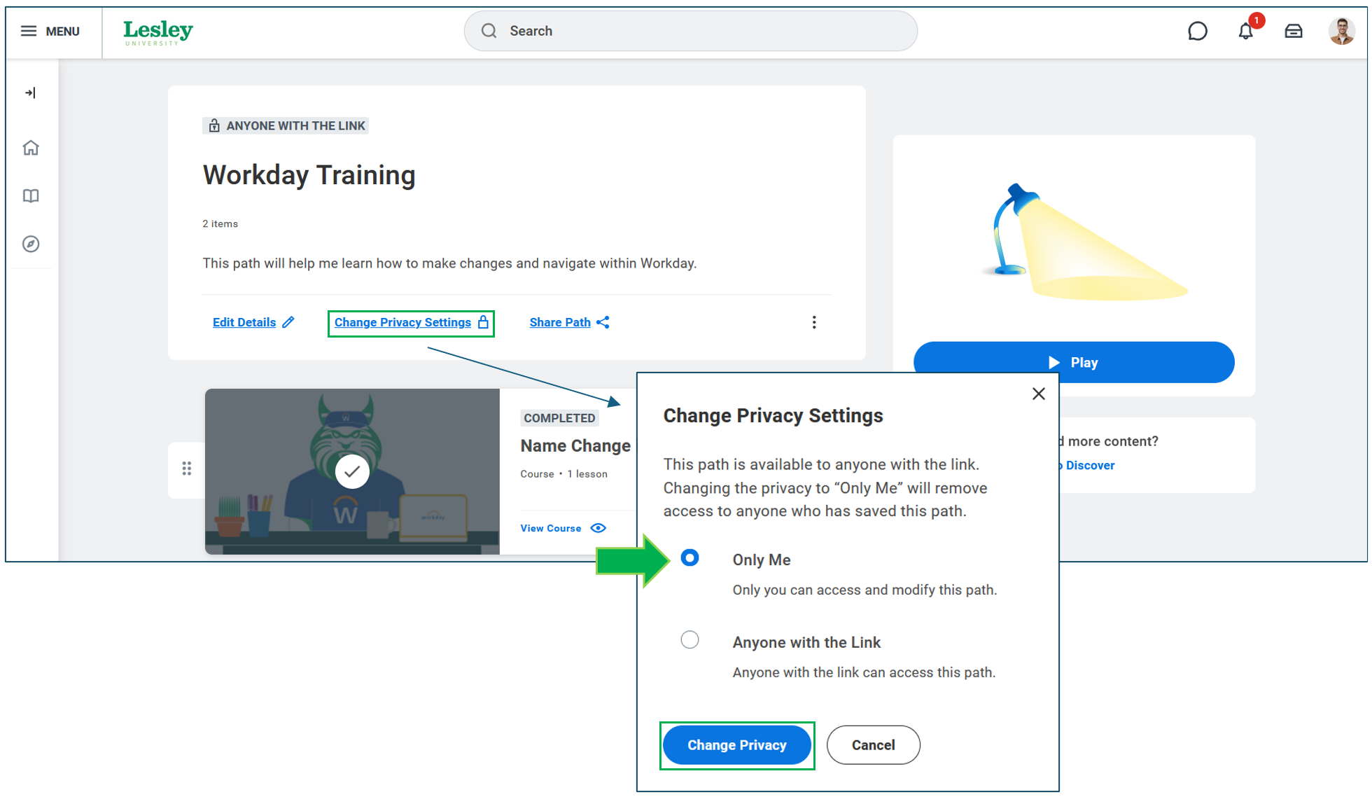 If you no longer want the learning path to be shared, go to the path itself and click Change Privacy Settings. Then set the settings to Only Me. Click Change Privacy to save your changes. The path privacy will be updated to only you will be able to see it.