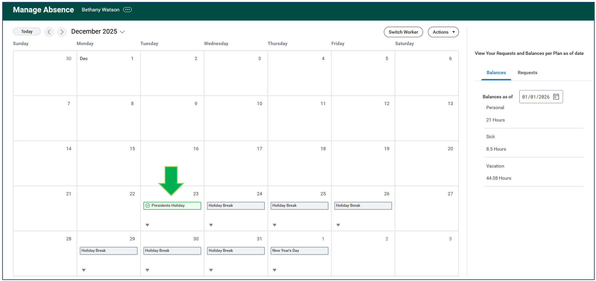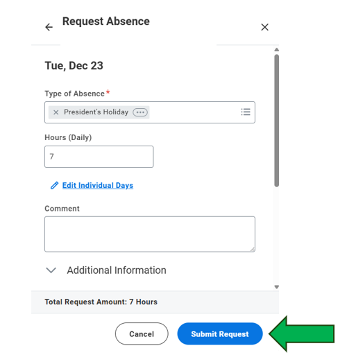 If you have already submitted a time off request such as Vacation on a President's Holiday and wish to update the type of absence, please refer to this article on how to correct your time off request. Manage Absence in Workday.