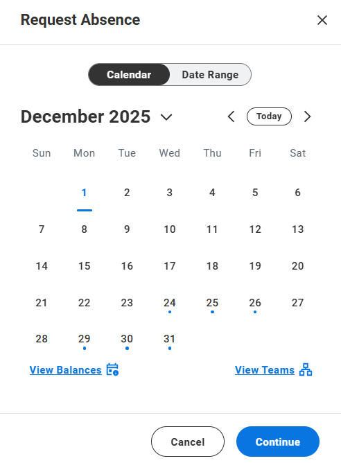 On the Workday homepage, select the Request Absence action underneath the homepage banner.