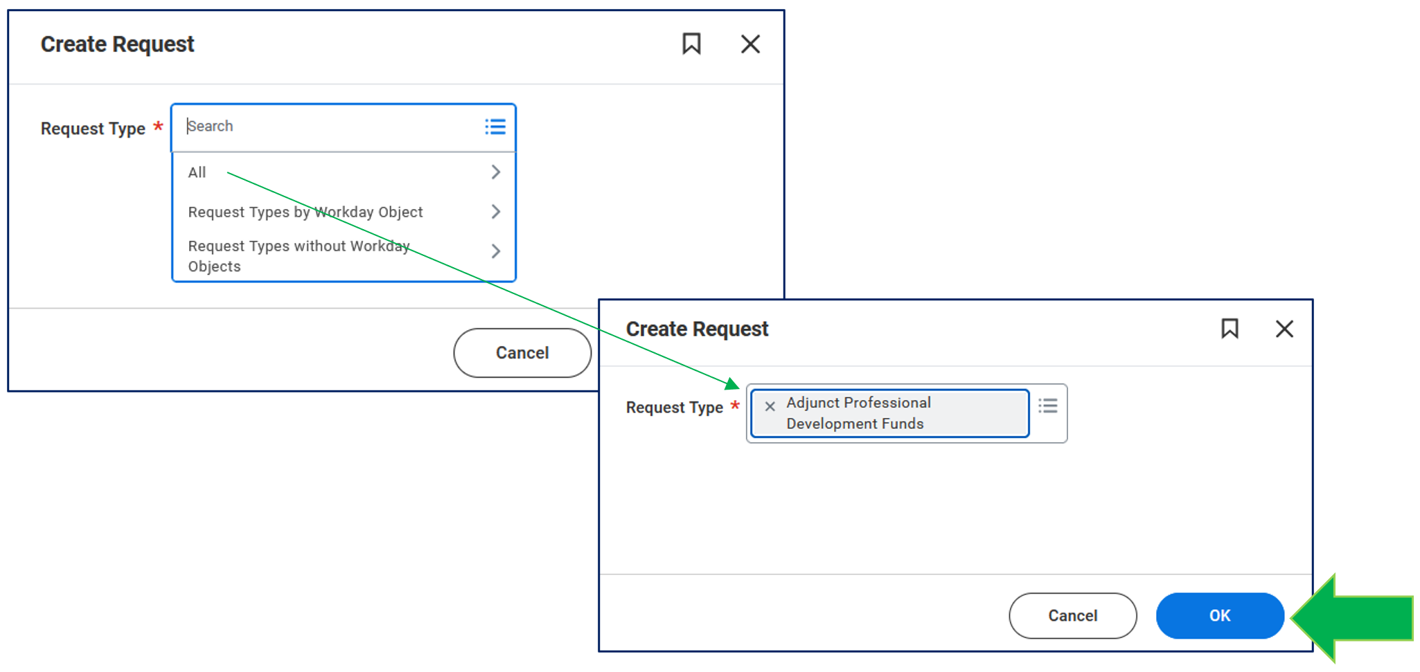 You will be directed to a drop-down screen. To select a form, click on the drop-down All -> Adjunct Professional Development Funds. Once you have selected the form, click OK.
