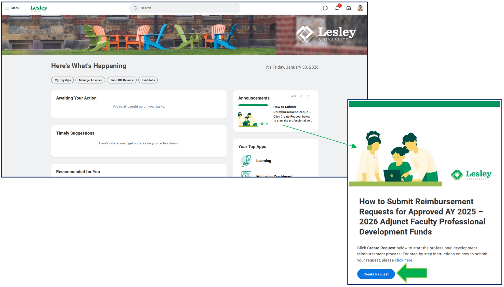 To request reimbursement from your approved professional development funds, login to Workday and submit a request via the announcement section of your homepage. Click Create Request to begin the process.